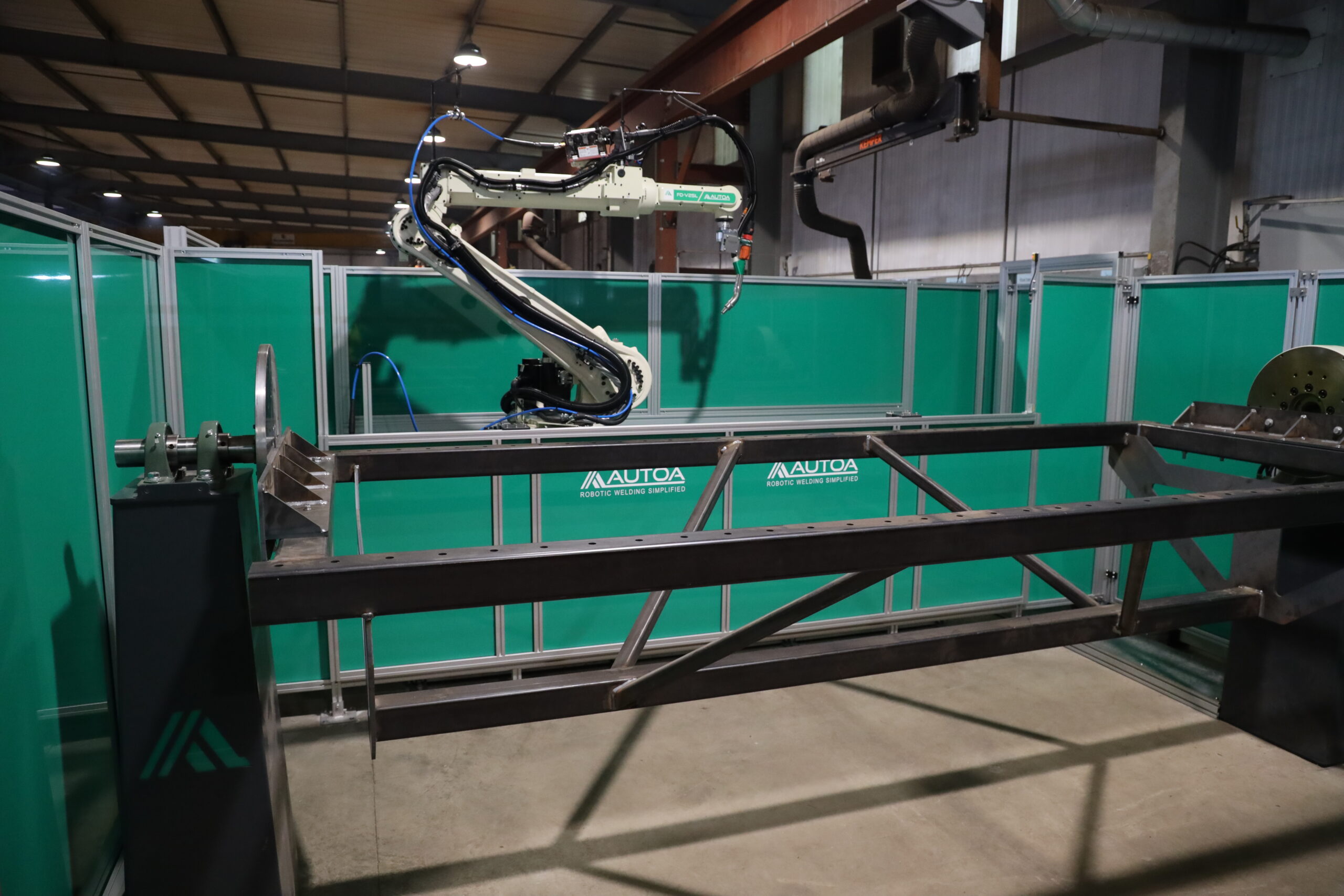 Featured Equipment: OTC FD-V25L Robot Arm, OTC Fd-19 Controller + Teach Pendant, OTC P502L Power Source + 500A Water Cooled Torch, OTC 1PC1000 Headstock + Tailstock Positioner, Autoa 2000mm Servo Controlled Floor Positioner, Autoa Digital Touch Sense, Autoa Tip Cleaner Station, Integrated Safety Componentry.